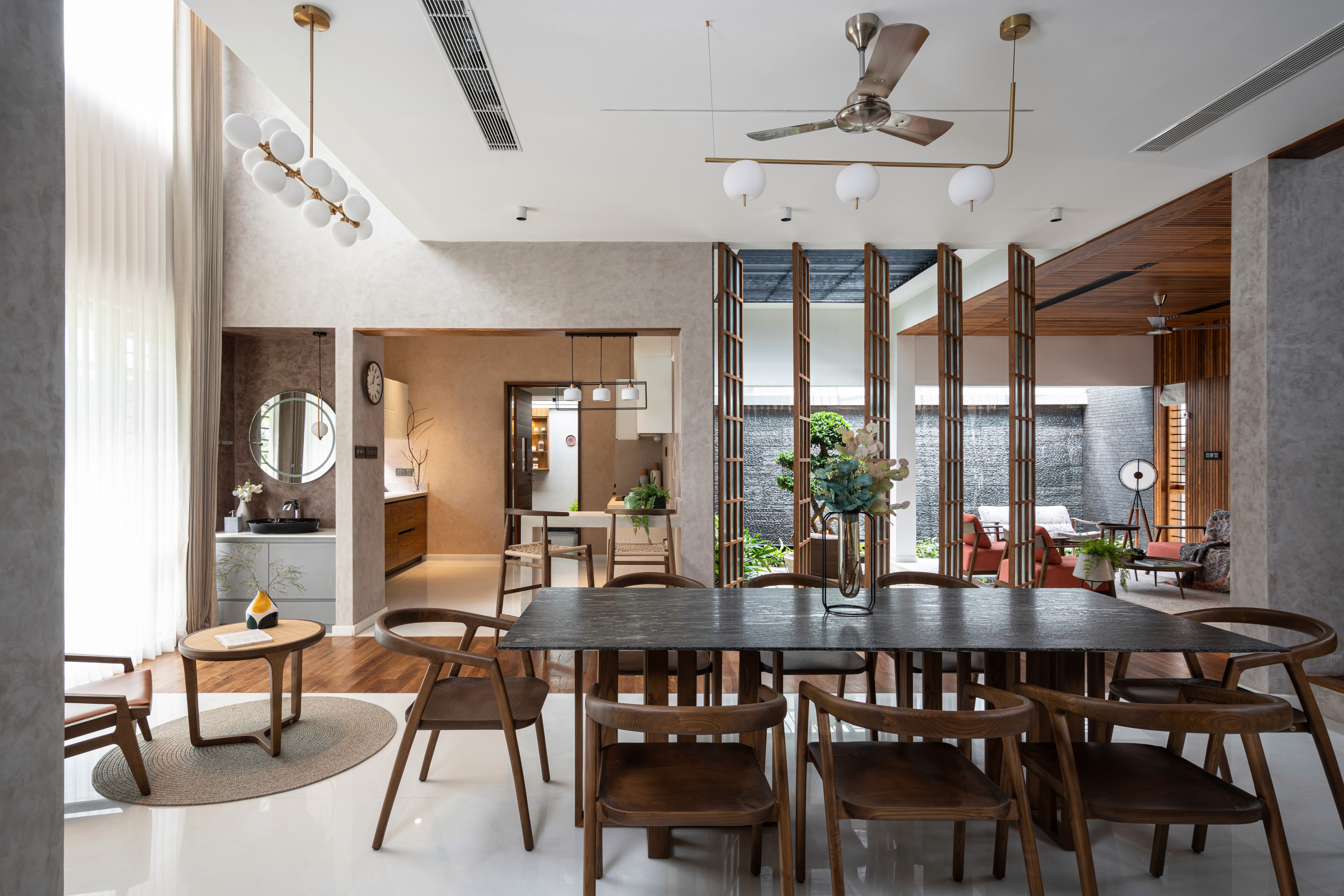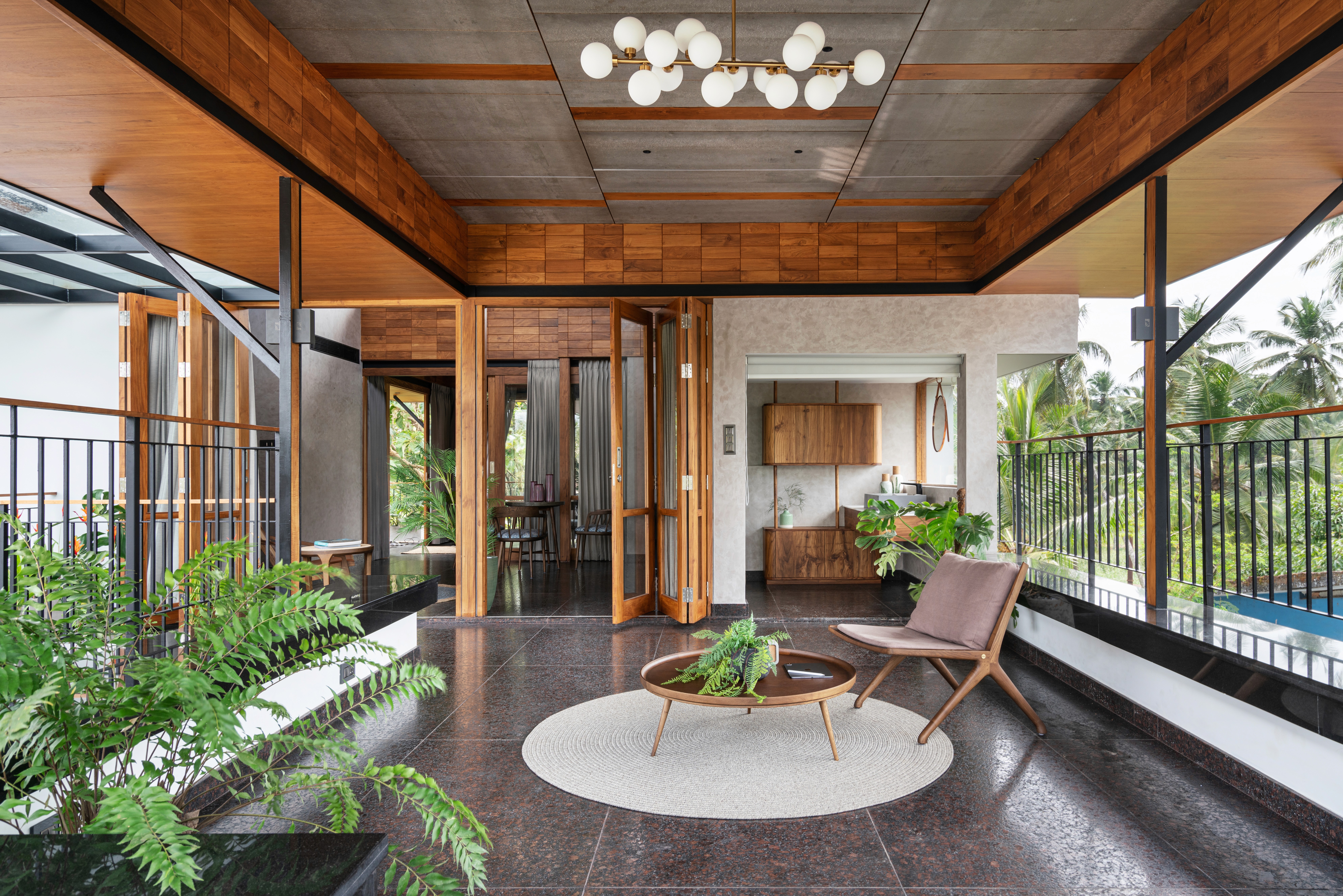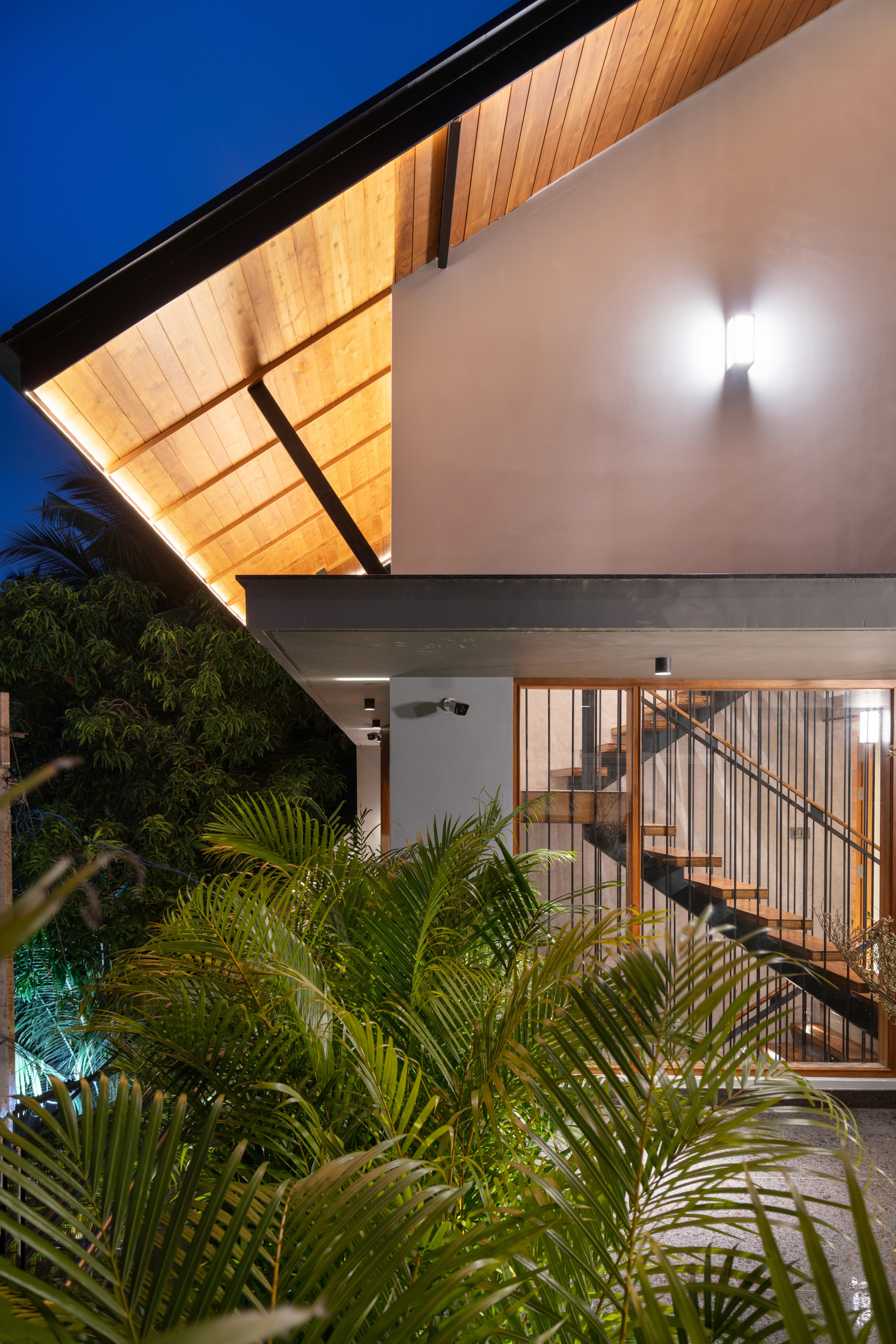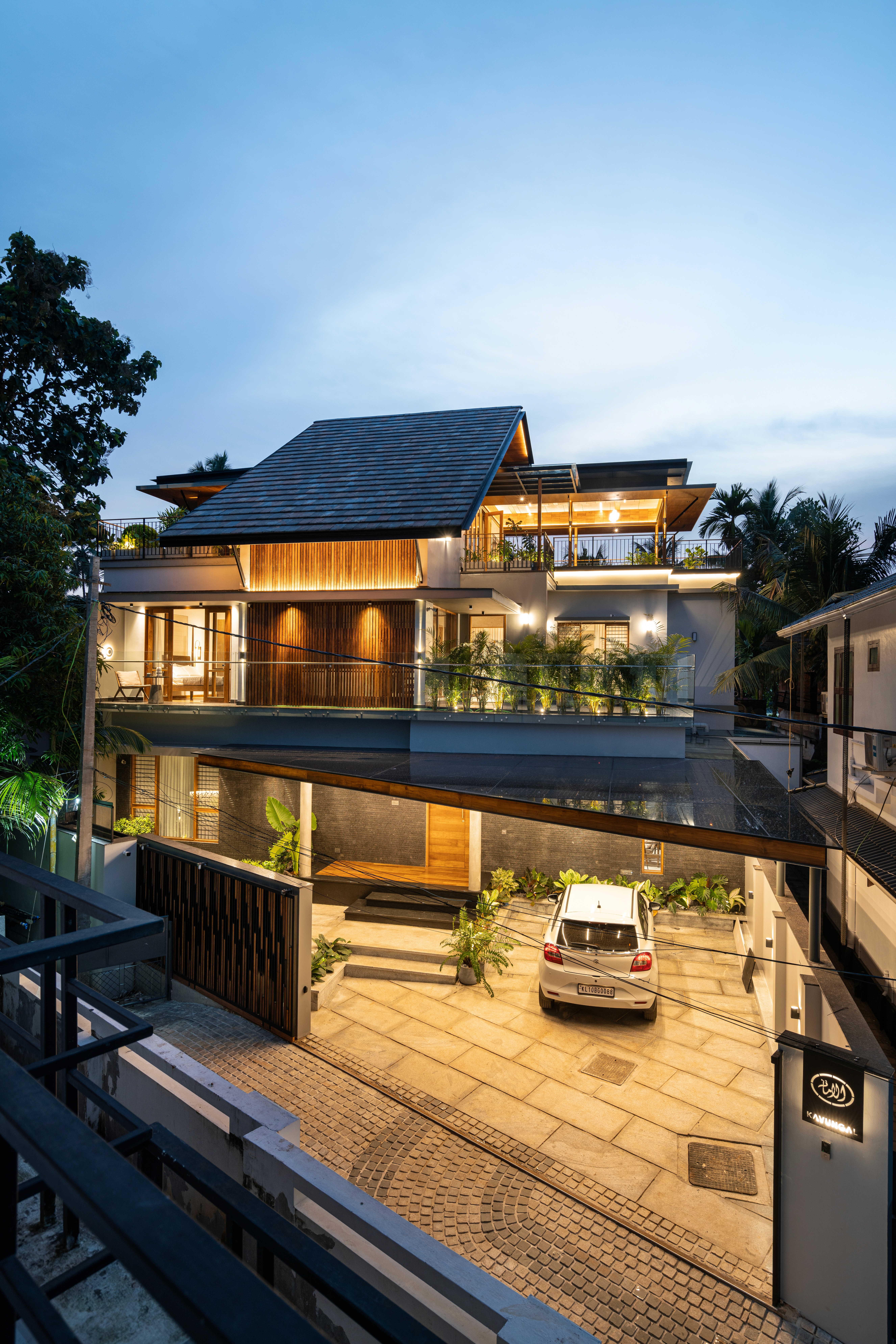 Nestled within an 8-cent plot in the dense, semi-urban fabric of Beypore—Kerala’s ancient port town—this tropical modern residence was conceived as a calm, inward-looking sanctuary amidst the surrounding urban bustle. The client’s brief was clear: a home that feels private, serene, and deeply personal, while responding sensitively to its tightly packed context. The design evolved into a three-storeyed structure organized around a series of intermediate courtyards. These voids become the spatial spine of the house, enabling an open-plan experience, visual continuity, and effective cross-ventilation, all while preserving privacy from the busy neighbourhood. This strategy allowed us to maximise the built-up area without compromising on light, air, or intimacy. The ground floor accommodates a generous covered car porch and sit-out, leading into separate living and dining spaces that are visually and physically connected through a green courtyard. Two bedrooms with attached toilets, an open kitchen, and adjoining work and utility areas complete this level. Large openings from the living room and guest bedroom extend towards the lawn, creating a seamless indoor-outdoor relationship and an enhanced perception of space. The first floor houses two well-appointed ensuite bedrooms designed for comfort and privacy. The second floor forms the emotional core of the home—a collection of ‘combo spaces’ that include a home library, study, gym, and a private Jacuzzi. These spaces open out to terrace courtyards, offering moments of pause, openness, and retreat above the city below.