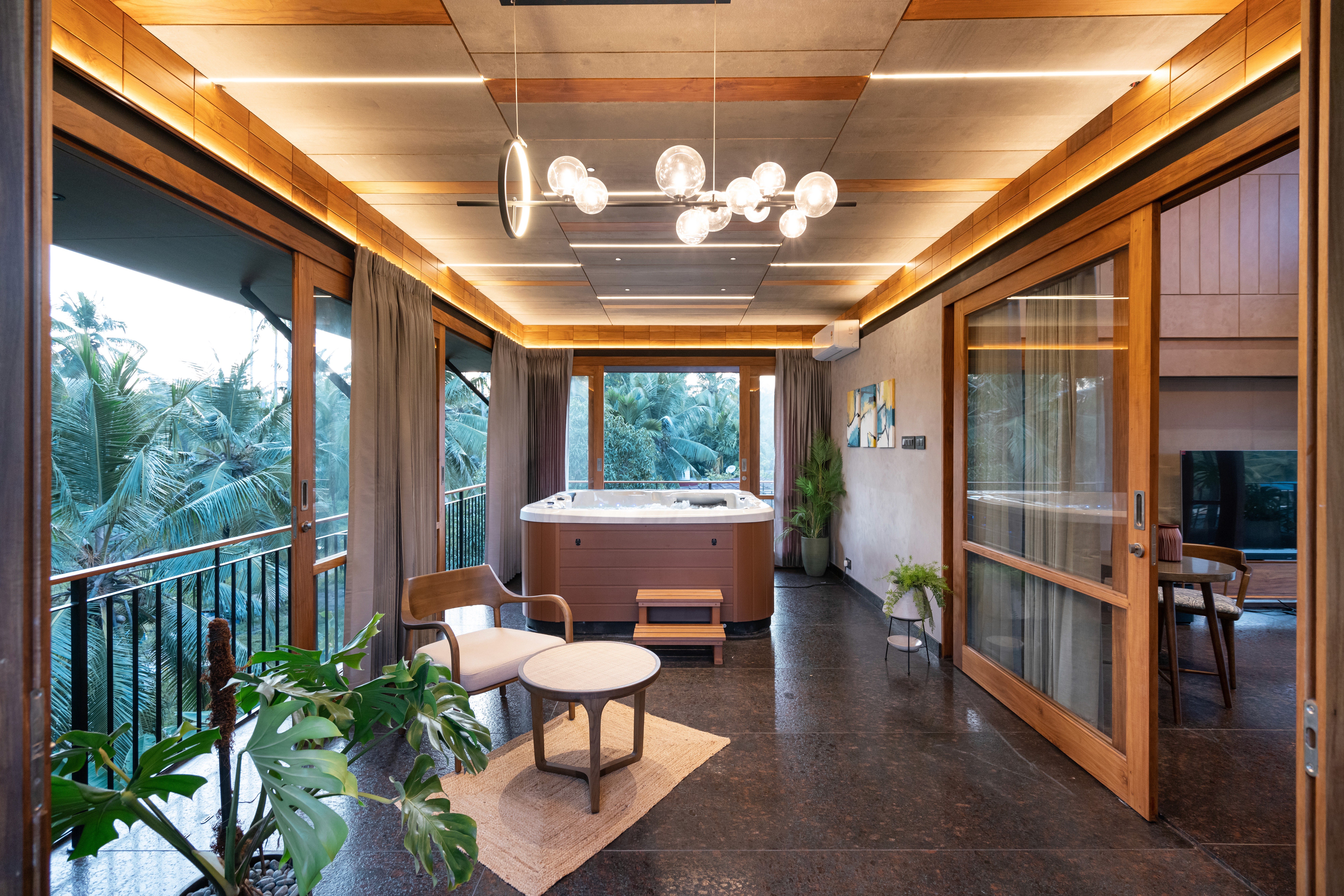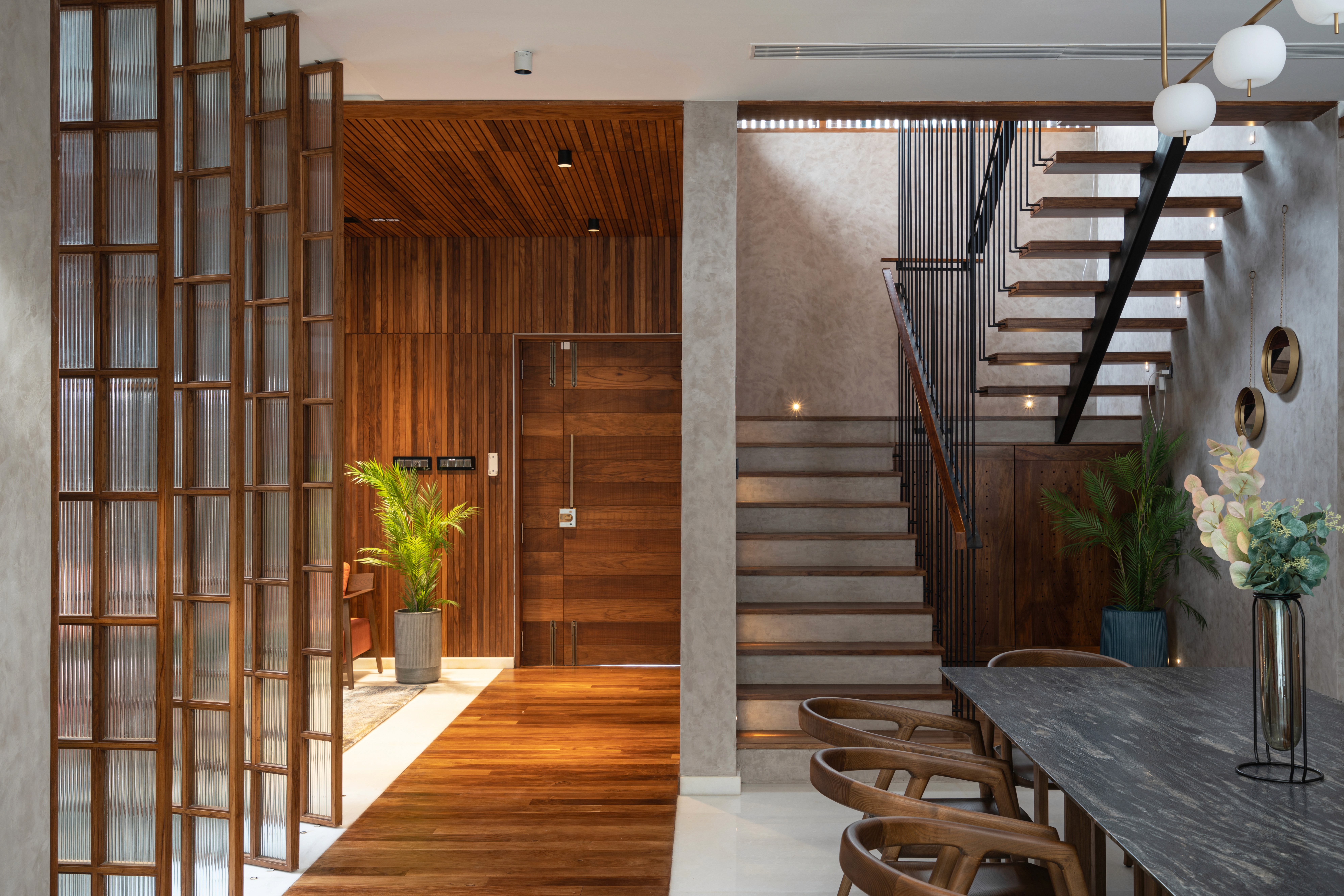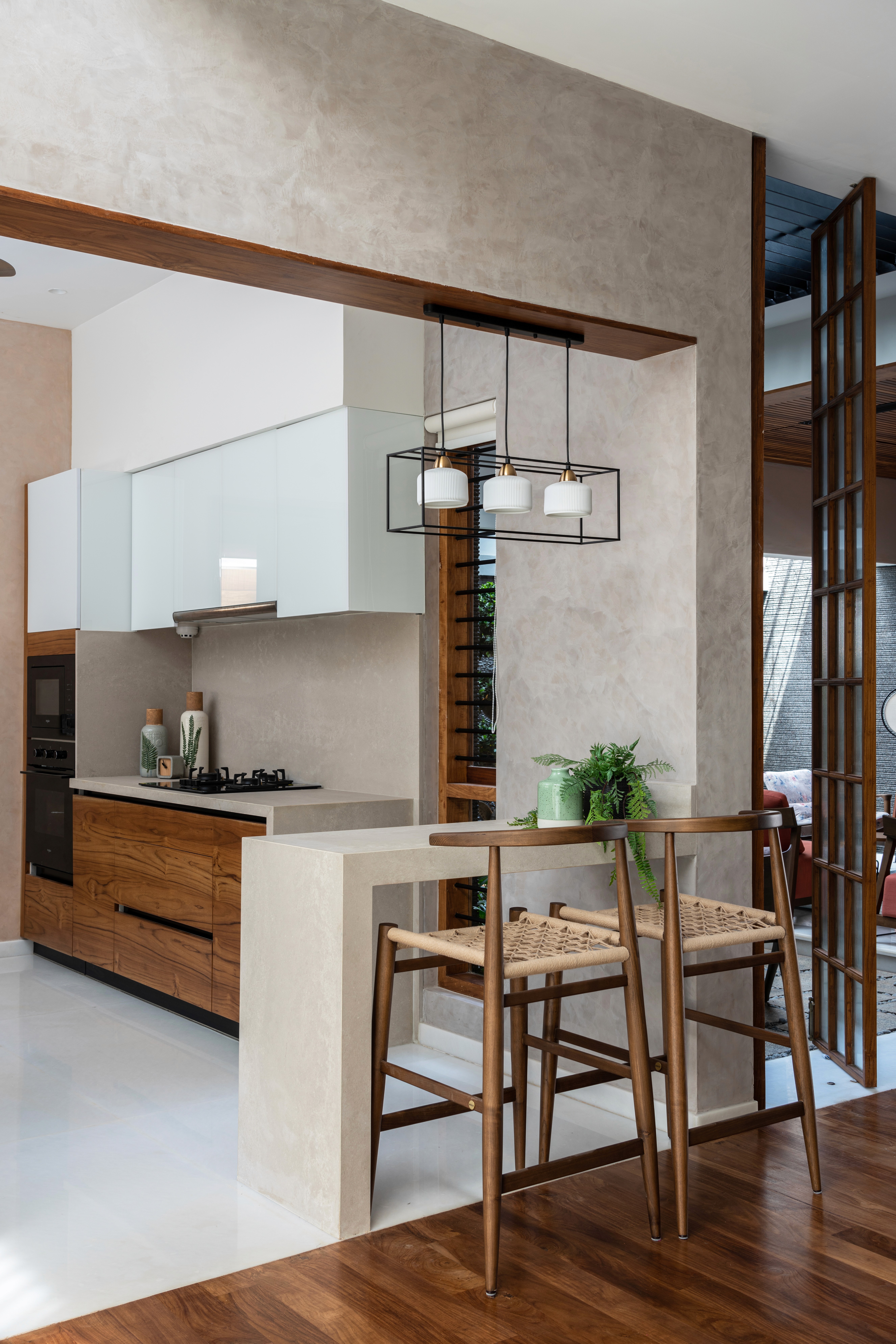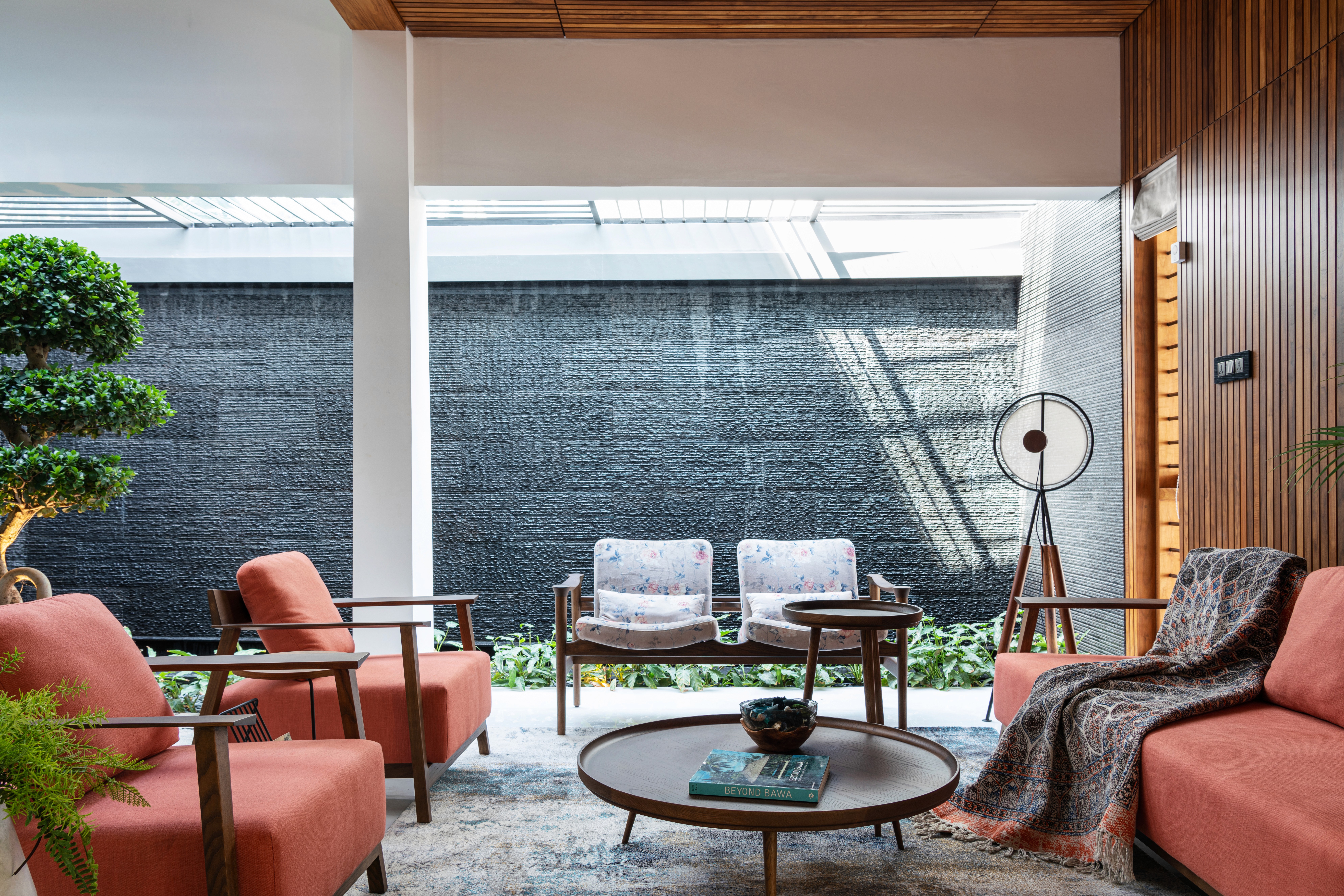Nestled within an 8-cent plot in the dense, semi-urban fabric of Beypore—Kerala’s ancient port town—this tropical modern residence was conceived as a calm, inward-looking sanctuary amidst the surrounding urban bustle. The client’s brief was clear: a home that feels private, serene, and deeply personal, while responding sensitively to its tightly packed context. The design evolved into a three-storeyed structure organized around a series of intermediate courtyards. These voids become the spatial spine of the house, enabling an open-plan experience, visual continuity, and effective cross-ventilation, all while preserving privacy from the busy neighbourhood. This strategy allowed us to maximise the built-up area without compromising on light, air, or intimacy. The ground floor accommodates a generous covered car porch and sit-out, leading into separate living and dining spaces that are visually and physically connected through a green courtyard. Two bedrooms with attached toilets, an open kitchen, and adjoining work and utility areas complete this level. Large openings from the living room and guest bedroom extend towards the lawn, creating a seamless indoor-outdoor relationship and an enhanced perception of space. The first floor houses two well-appointed ensuite bedrooms designed for comfort and privacy. The second floor forms the emotional core of the home—a collection of ‘combo spaces’ that include a home library, study, gym, and a private Jacuzzi. These spaces open out to terrace courtyards, offering moments of pause, openness, and retreat above the city below.