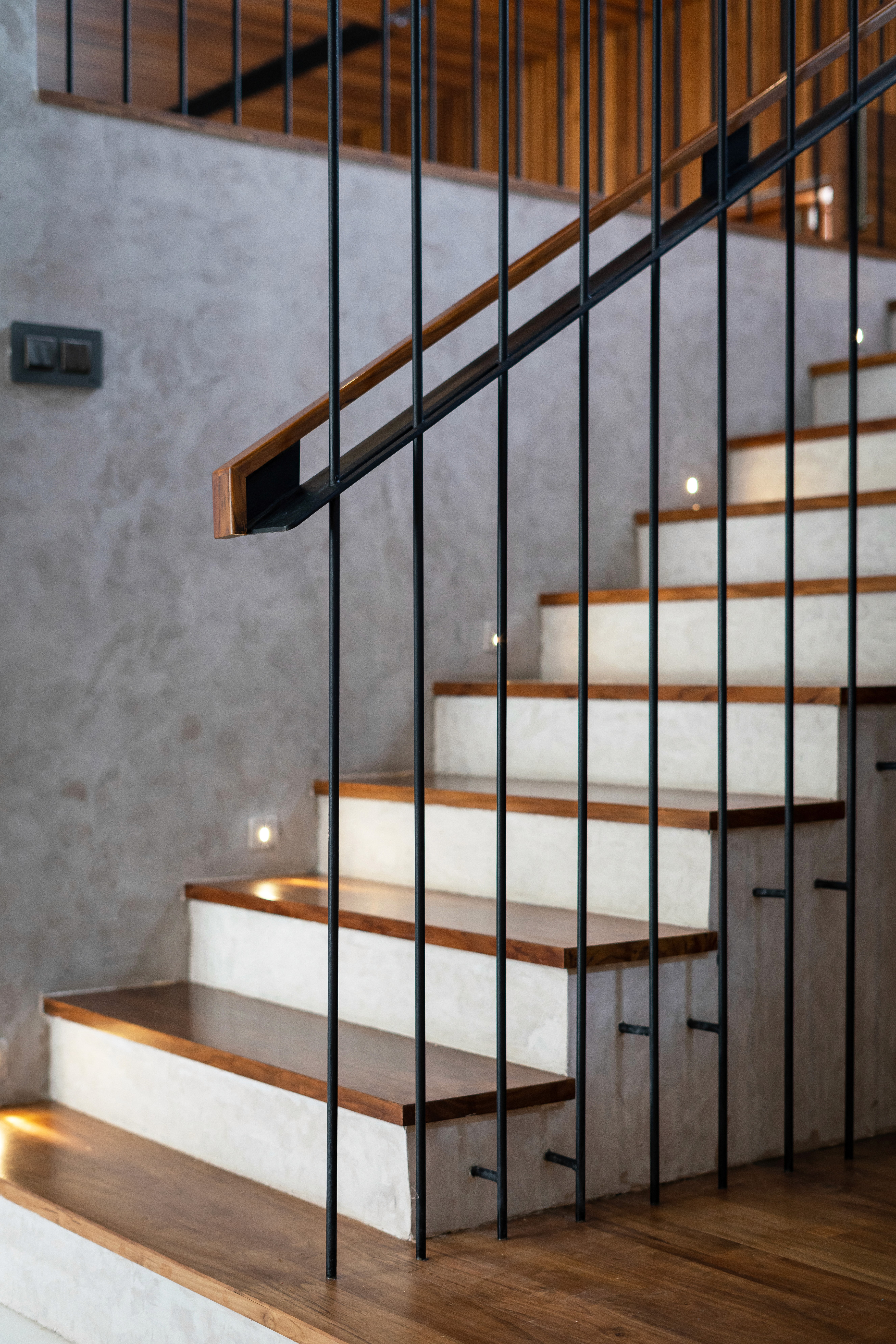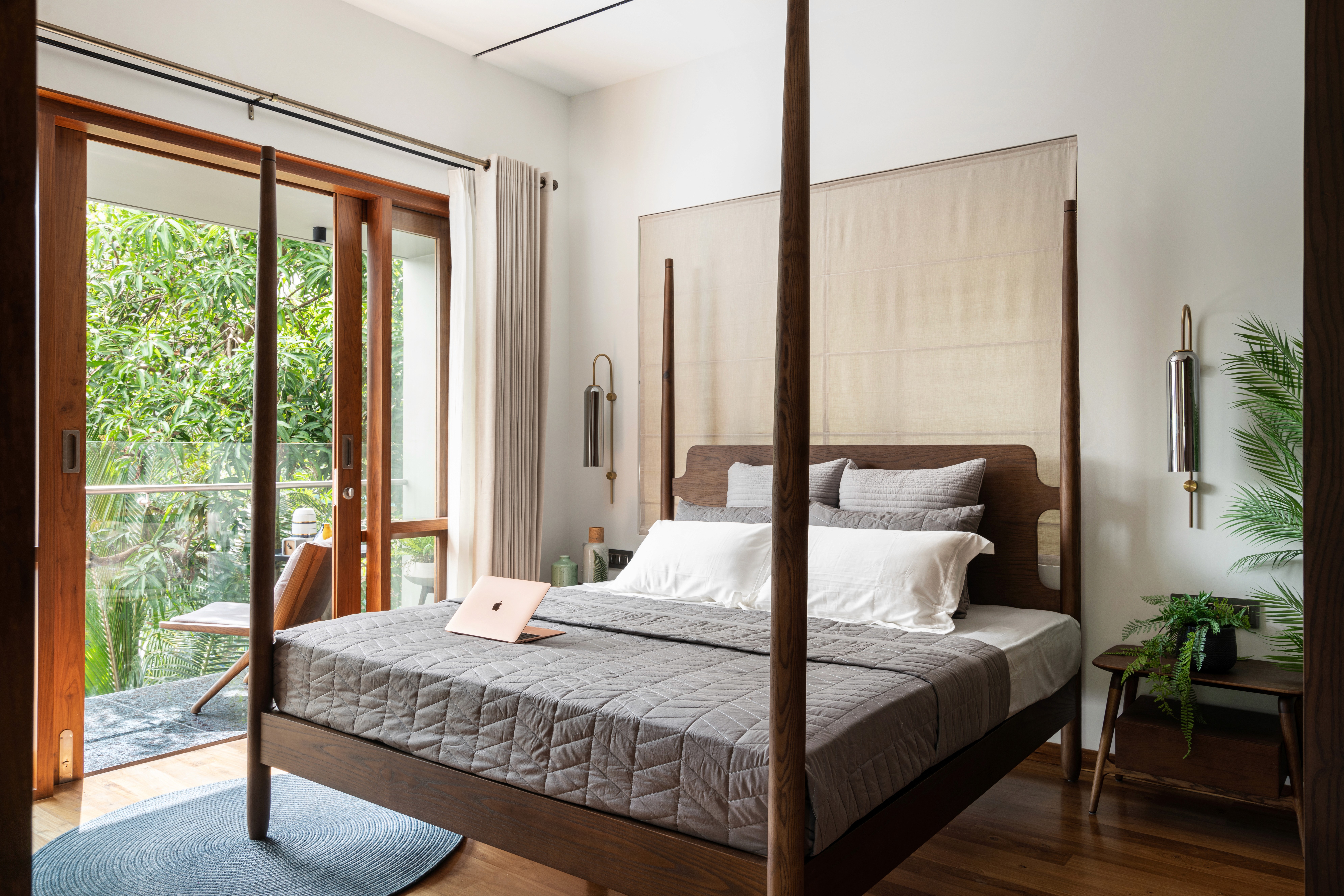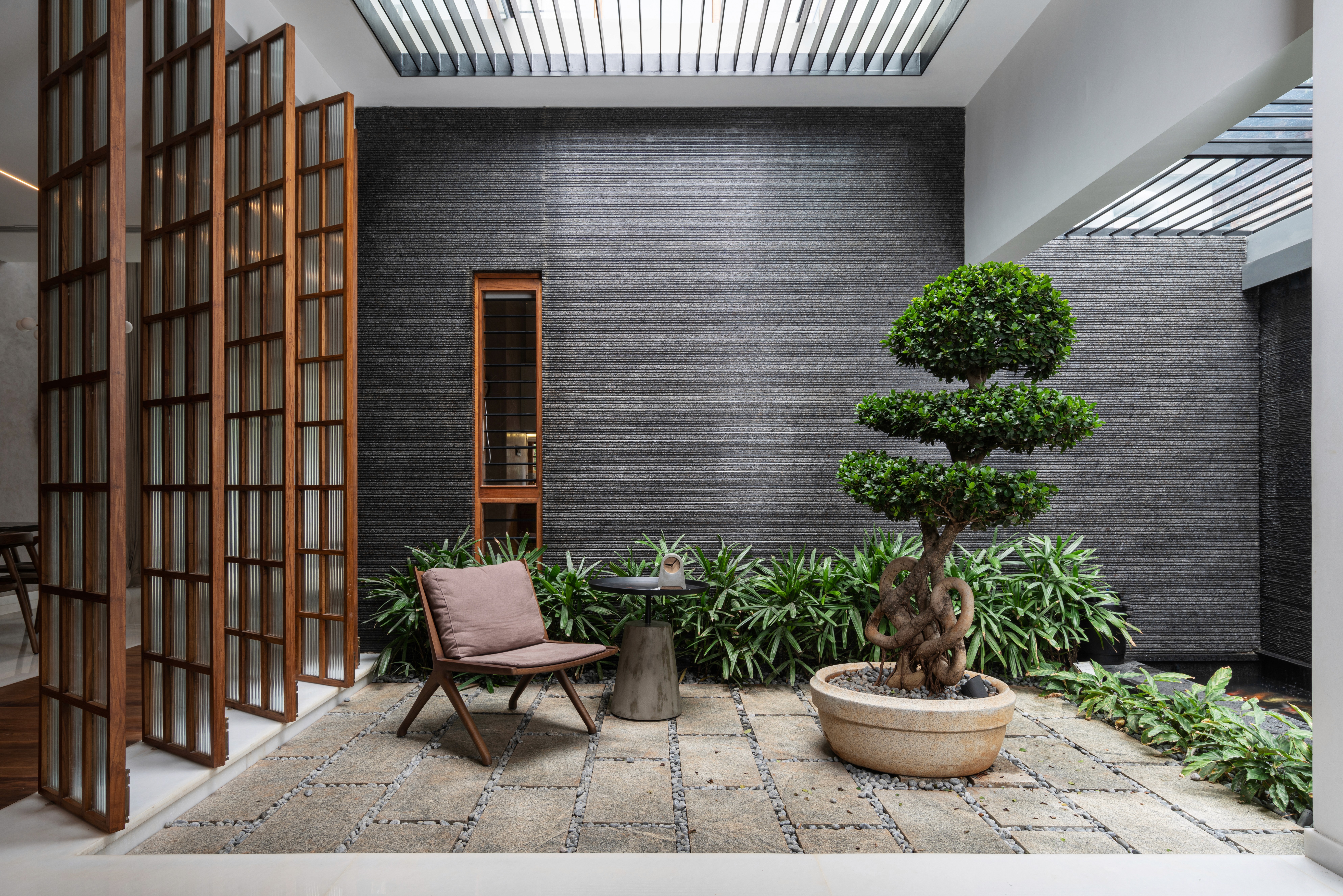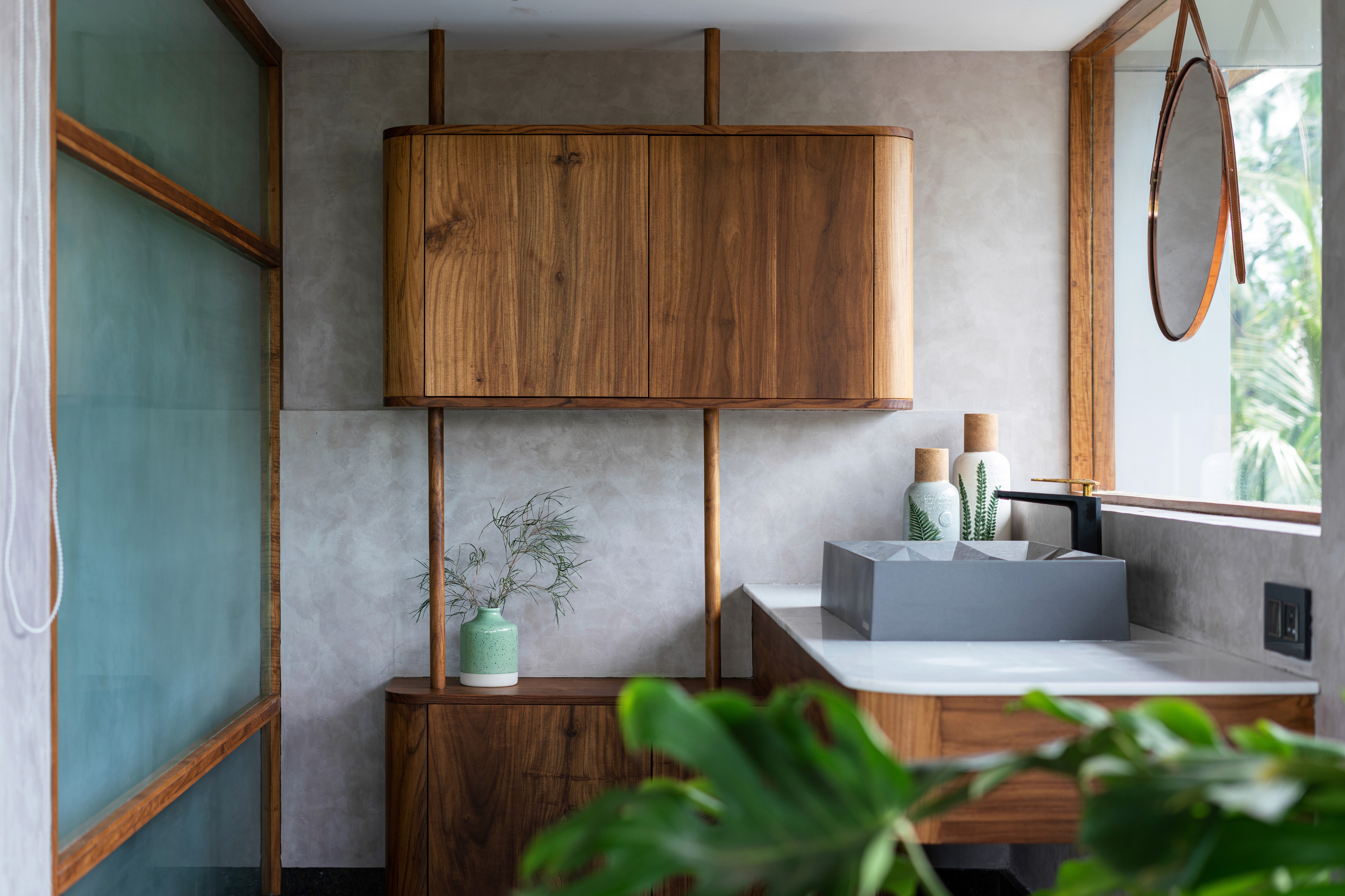 Nestled within an 8-cent plot in the dense, semi-urban fabric of Beypore—Kerala’s ancient port town—this tropical modern residence was conceived as a calm, inward-looking sanctuary amidst the surrounding urban bustle. The client’s brief was clear: a home that feels private, serene, and deeply personal, while responding sensitively to its tightly packed context. The design evolved into a three-storeyed structure organized around a series of intermediate courtyards. These voids become the spatial spine of the house, enabling an open-plan experience, visual continuity, and effective cross-ventilation, all while preserving privacy from the busy neighbourhood. This strategy allowed us to maximise the built-up area without compromising on light, air, or intimacy. The ground floor accommodates a generous covered car porch and sit-out, leading into separate living and dining spaces that are visually and physically connected through a green courtyard. Two bedrooms with attached toilets, an open kitchen, and adjoining work and utility areas complete this level. Large openings from the living room and guest bedroom extend towards the lawn, creating a seamless indoor-outdoor relationship and an enhanced perception of space. The first floor houses two well-appointed ensuite bedrooms designed for comfort and privacy. The second floor forms the emotional core of the home—a collection of ‘combo spaces’ that include a home library, study, gym, and a private Jacuzzi. These spaces open out to terrace courtyards, offering moments of pause, openness, and retreat above the city below.